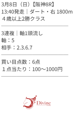 阪神7Rでディバインが出していた三連複BOX1・2・5・6・7は、まさにそこをちゃんと狙っていた感じでした。