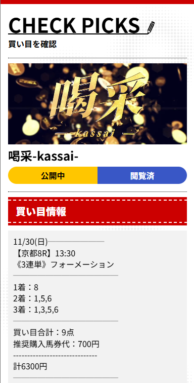 コールセンターのクレーム対応で心削られがちな私ですが、本当にストレスがたまり過ぎた平日夜にストレス発散がてらに買った「喝采-kassai-」の京都8Rが見事的中。8→5→6の決着で、6,300円が ¥352,100。あの瞬間だけは、クレームの嵐も忘れられました。名前の通り、思わず拍手したくなる的中でした。年末まではクレームの罵詈雑言をお金があるという最強のスルースキルで頑張りたいと思います!