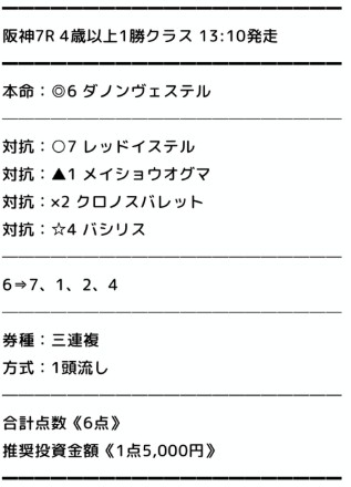 阪神7Rの無料予想だけで23万1900円もてにいれることが出来ました!