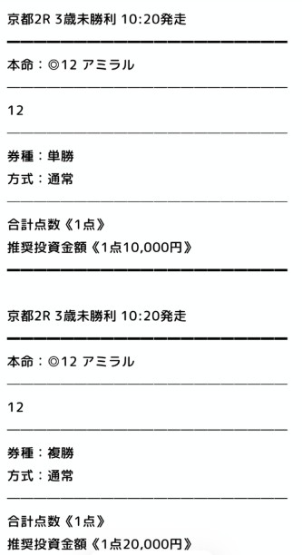 今回18日(日)の無料予想で買い目点数1点で京都2Rで単複的中